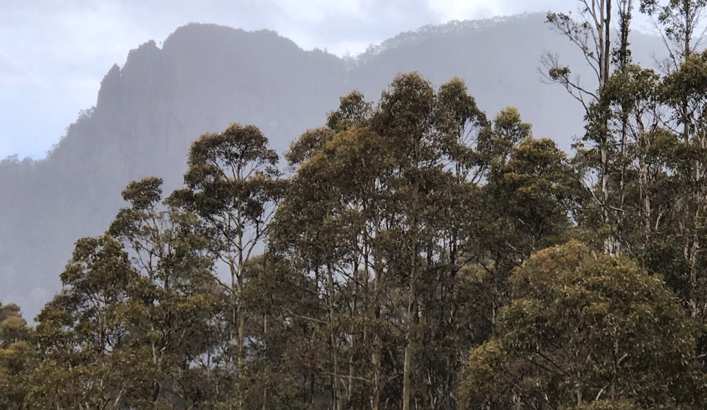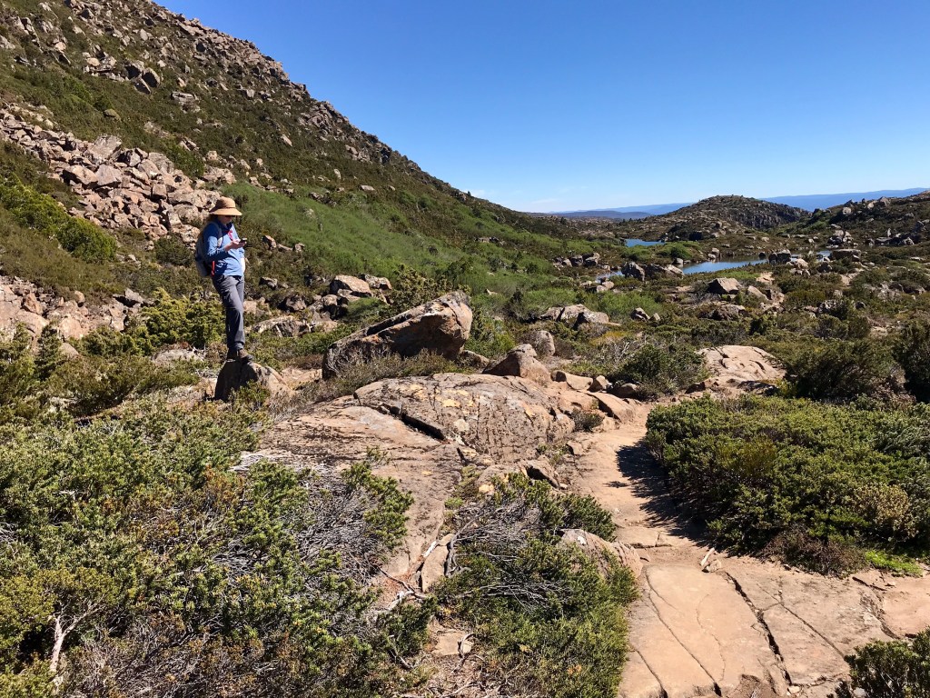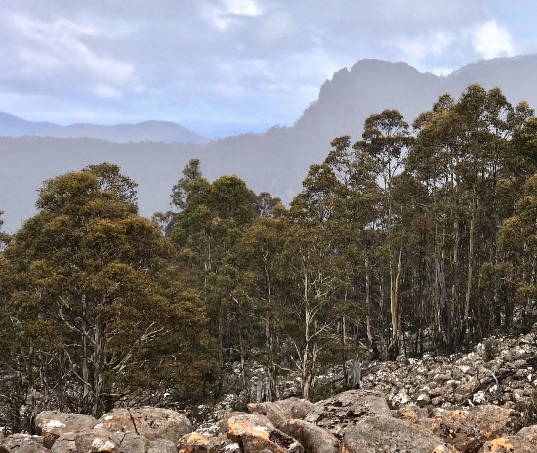Starting at the Springs along Milles Track, it’s deceptively easy going, until the rock and boulder hopping begins. There are several panoramic views across the Derwent River. The rocky but well maintained track through lovely forest and heath, soon reaches the Potato Field, a stretch of endless wet and unstable rocks back up to the tree line. I managed to restrict myself to just two stumbles, and collected a few more minor grazes and bruises.